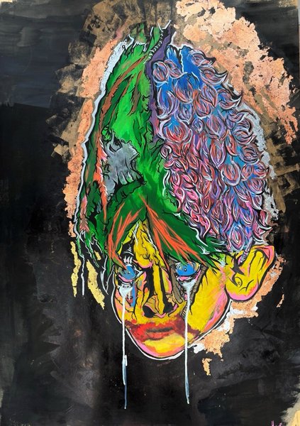 Die Bilder von Herrn E. zeigen sein Leben und das der Anderen. Durch die Kunst hat er seine in Vergessenheit geratene Wahrnehmung wiederentdeckt und erfahren, wer er ist, was er als „negative und positive Depression“ bezeichnet, die er darstellen möchte. Mit seinen Arbeiten möchte er Menschen helfen und für sie da sein. Das Motto seiner Technik? „Ich sehe, was du nicht siehst.“ Hierzu vermischt er viele Techniken und Materialien und lässt sein Herz entscheiden, wann ein Bild fertig ist.